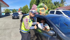 Terlihat personel Sat Lantas polres Mukomuko saat memberikan brosur kepada pengendara roda 4 Aiptu Harlen saat dikonfirmasi menyampaikan, “pagi ini kita melaksanakan pembagian brosur dan juga mensosialisasikan kepada masyarakat pentingnya melengkapi persyaratan dan perlengkapan saat berkendara untuk keselamatan saat berkendara dalam rangka operasi patuh Nala – 2023 ini ” jelas Aiptu Harlen.