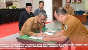 Usai penyampaian pendapat akhir Bupati Nias, kegiatan dilanjutkan dengan Penandatanganan Berita Acara Persetujuan Bersama Atas Ranperda RPJMD Kabupaten Nias Tahun 2025-2029, sumber Kominfo Kabupaten Nias.