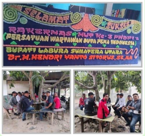 Labura – JejakKeadilan.com | Ketua DPC PWDPI Labura, M. Idris didampingi sekretaris Muhammad Yusup Harahap bersama bendahara Nasip menyampaikan apresiasi dan terimakasih atas dukungan bupati Labura, Dr. H. Hendriyanto Sitorus, SE.MM. Atas ucapan selamat dan sukses Rakernas dan HUT Ke-3 PWDPI di Bandar Lampung.