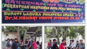 Labura – JejakKeadilan.com | Ketua DPC PWDPI Labura, M. Idris didampingi sekretaris Muhammad Yusup Harahap bersama bendahara Nasip menyampaikan apresiasi dan terimakasih atas dukungan bupati Labura, Dr. H. Hendriyanto Sitorus, SE.MM. Atas ucapan selamat dan sukses Rakernas dan HUT Ke-3 PWDPI di Bandar Lampung.