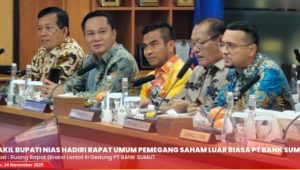 NIAS, JEJAKKEADILAN.COM – Wakil Bupati Nias Arota Lase, A.Md menghadiri Rapat Umum Pemegang Saham Luar Biasa (RUPSLB) PT Bank Sumut, bertempat di Ruang Rapat Direksi Lantai III Gedung PT Bank Sumut, Medan. Senin, 24 November 2025.