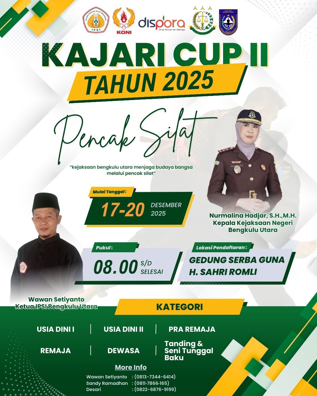 BENGKULU UTARA – Kajari Cup 2025, ajang pembinaan prestasi atlet pencak silat di Kabupaten Bengkulu Utara, Sabtu (29/11/2025).